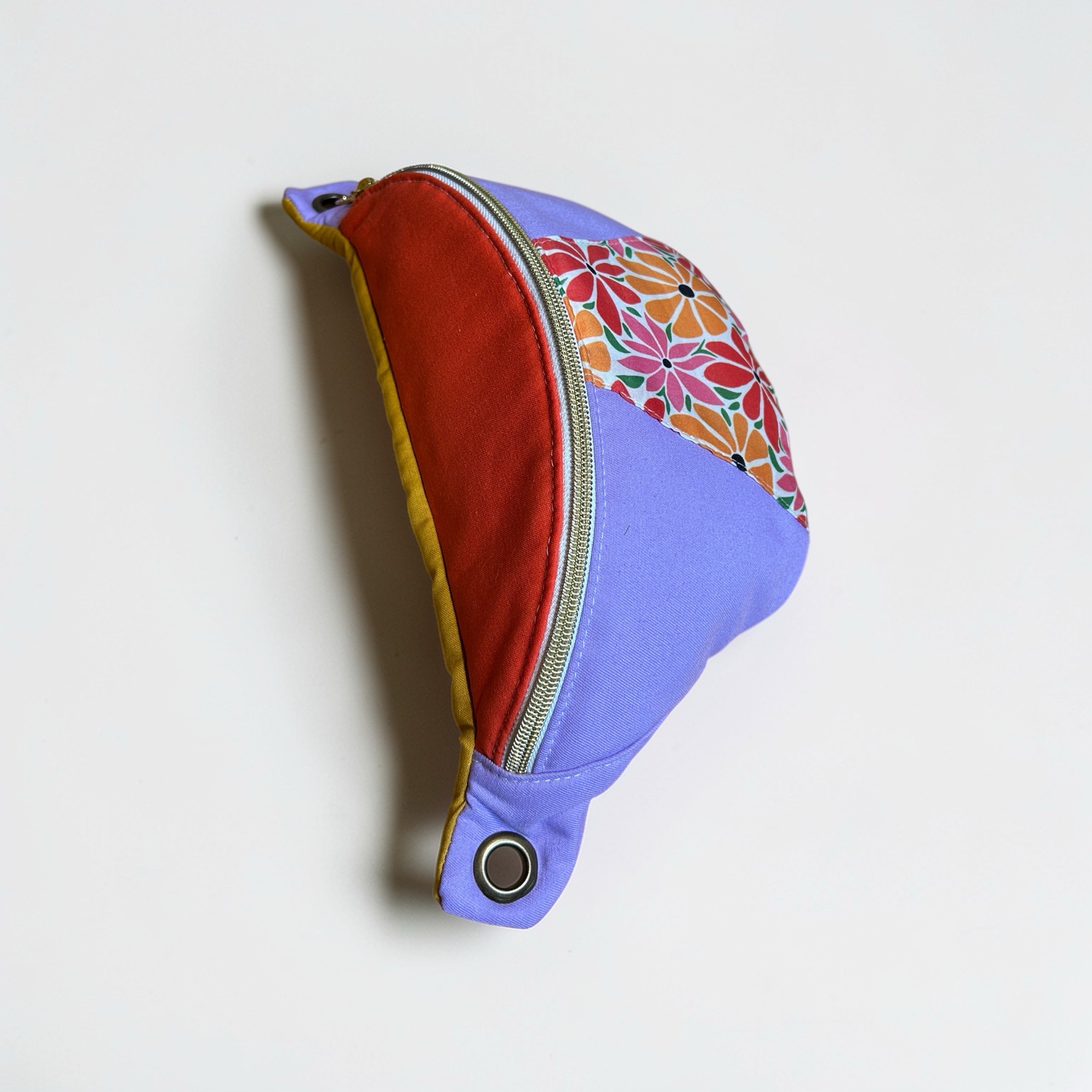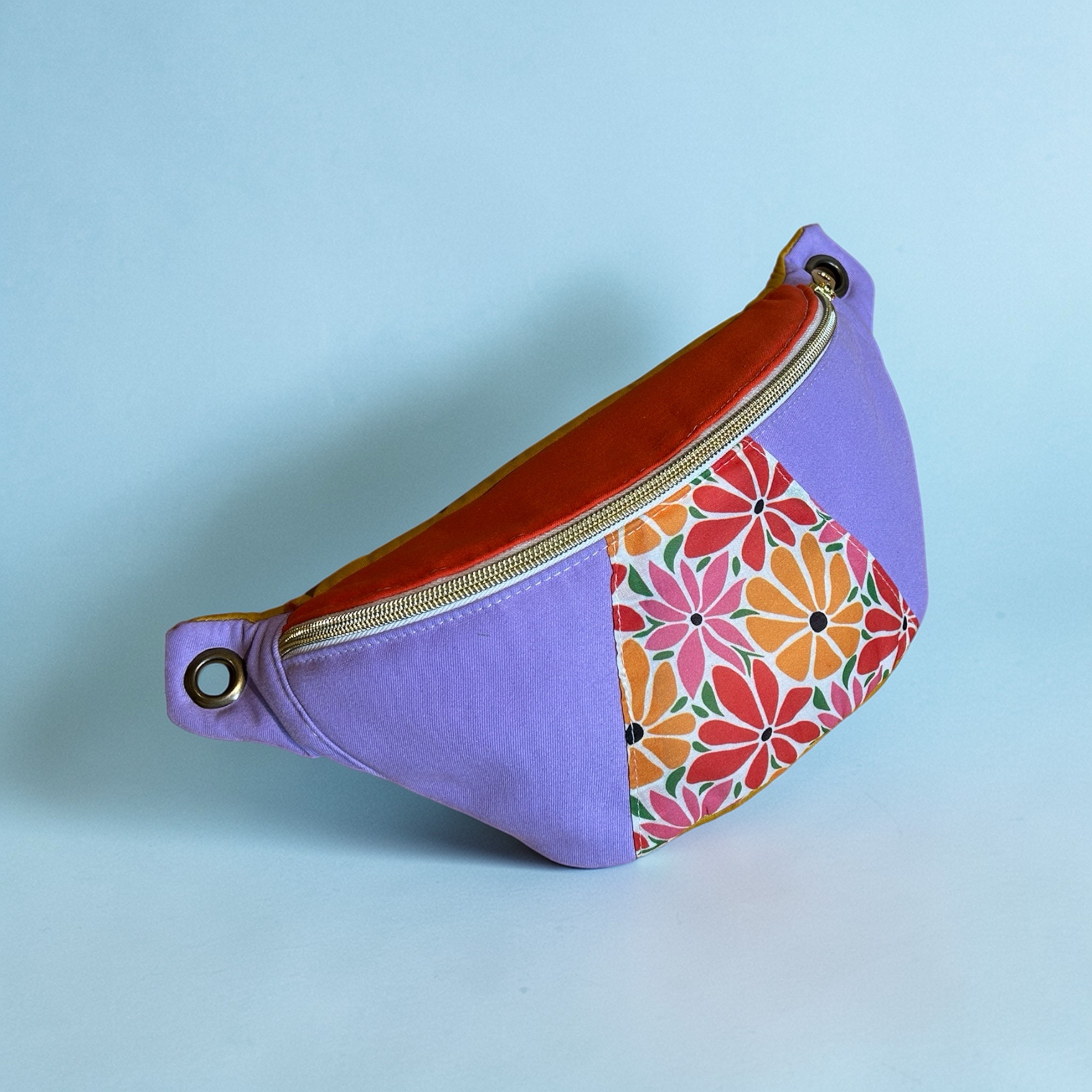 Tissu en coton parme, orange et jaune moutarde.